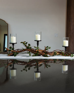 Enhance your dining table with a stunning green leaf vine and driftwood centerpiece. Blending an delicate artificial vine with iron hurricane candleholders, creating an enchanting arrangement that warmly invites you in. The vine accent brings a touch of nature to your home decor, while 3 pillar candles add an inviting warm glow, perfect for your most memorable gatherings.